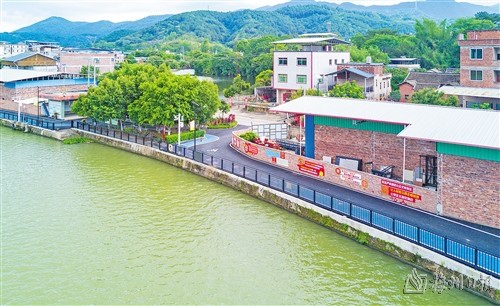 長沙圩鎮碧道鋪設了瀝青并劃分跑道和自行車道,“顏值”再獲提升。(林翔?攝)位于梅江河圩鎮段碧道沿線的紅色休閑廣場效果....